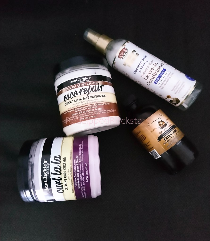 Anyway, I got a few supplies: Aunt Jackie’s Deep Conditioner and Curl Cream, African Pride Leave-In Conditioner, Jamaican Black Castor Oil and Almond Oil to mix in, a spritz bottle, scissors because my split ends needed to go, sectioning hair clips to help my attempts at parting my hair and of course shampoo and conditioner; I wasn’t sure which brand to get, so I just erred on the side of hydration, moisture.